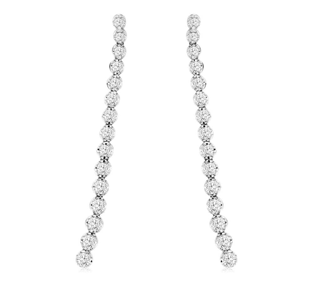 These elegant dangle earrings feature a total of 30 natural round diamonds, beautifully set in luxurious 14K white gold. With a total weight of 1.65 carats, they are the perfect accessory for any occasion. Threaded posts and backs.