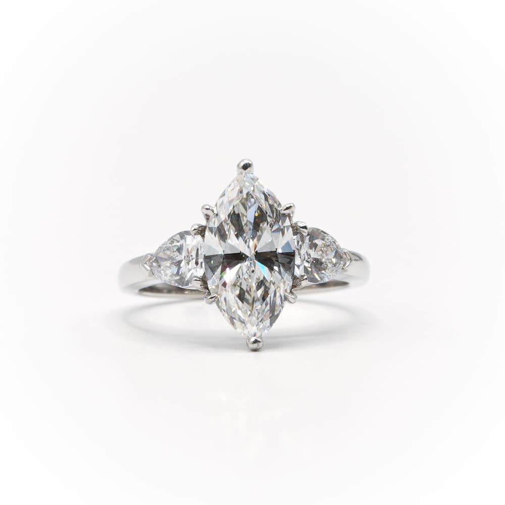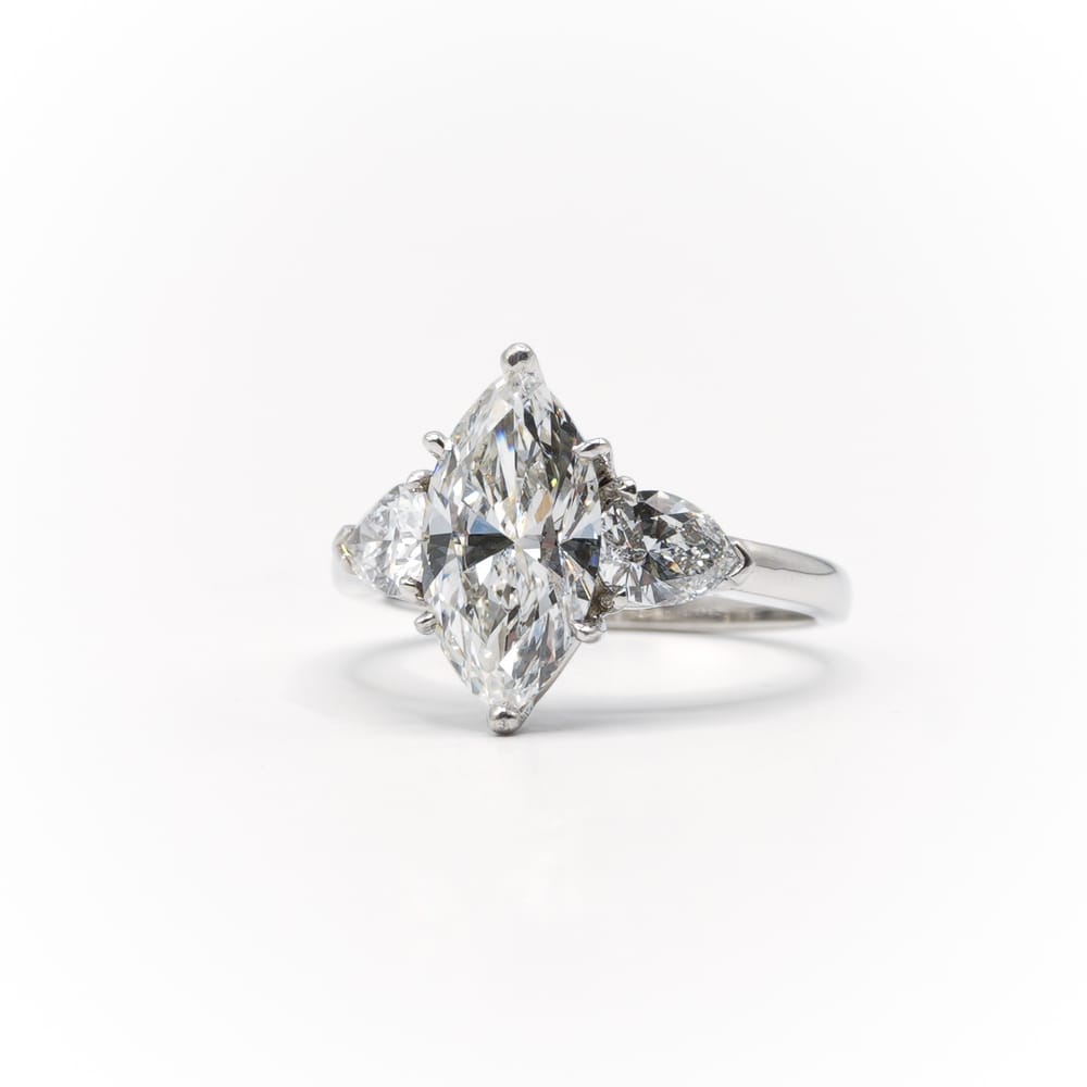 This elegant engagement ring features a 2.64ct marquise cut natural diamond, GIA certified, with E color and VS2 clarity, complemented by two pear-shaped diamonds totaling 0.80ctw, all set in luxurious platinum. This ring is a size 7 but can be resized upon request.