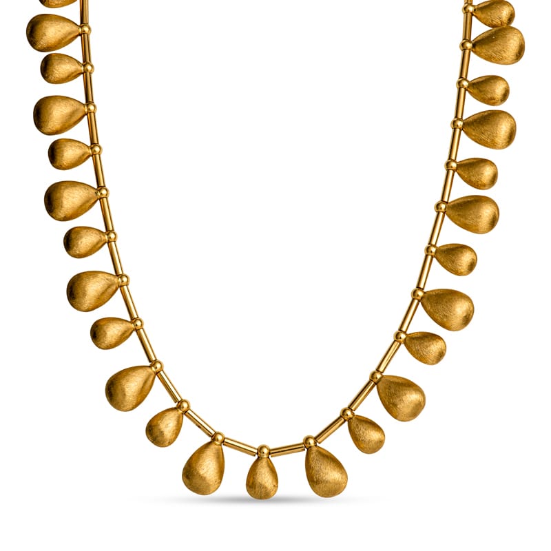 This beautiful necklace showcases intricate textured dangle designs crafted from luxurious 22 karat Italian yellow gold. Its elegant style is ideal for enhancing your wardrobe with a touch of grace and sophistication. This necklace is approximately 16.5″.