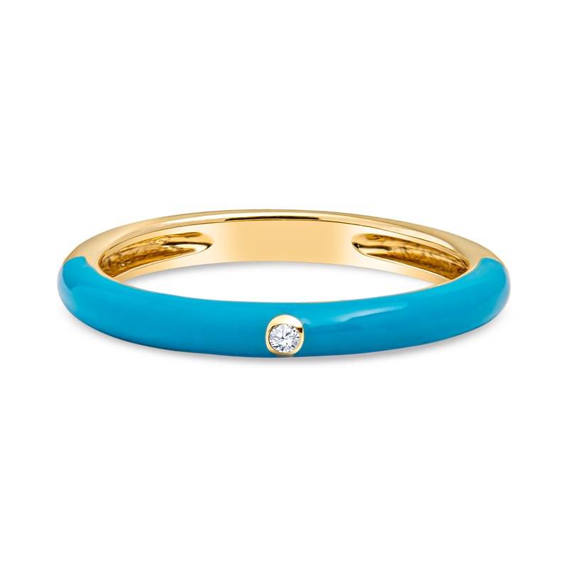 This 14 karat yellow gold band features blue enamel with a single diamond. You can wear alone or stack with your other favorite bands. This is a size 6.5 but can be resized upon request.