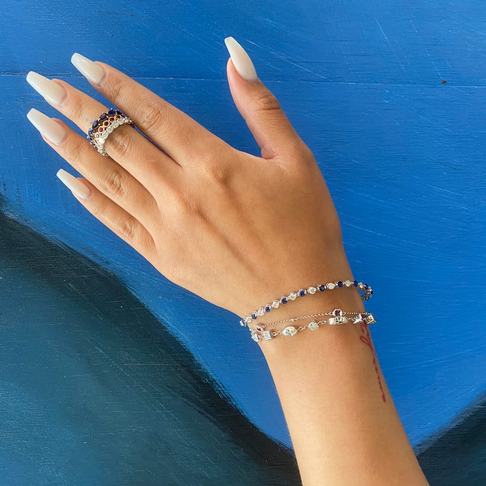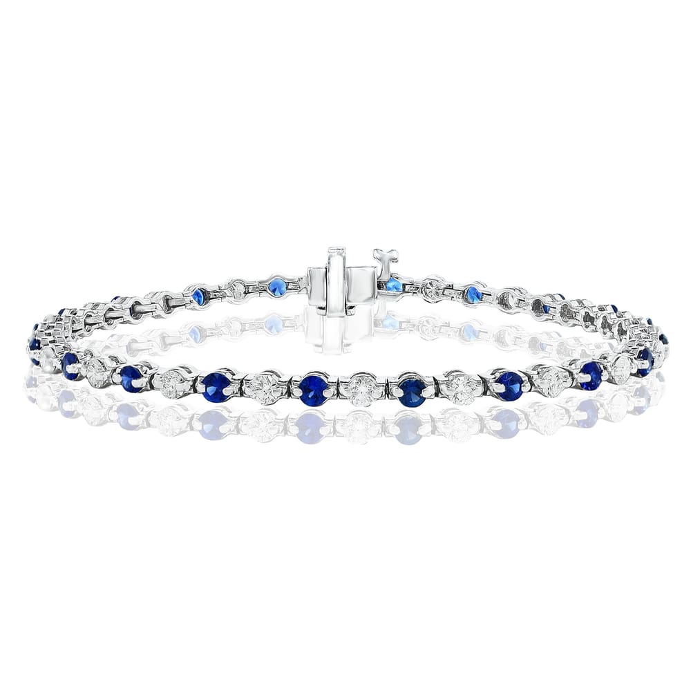 This beautiful bracelet features 2.45 carat total weight in round natural blue sapphires alternating with 2.01 carat total weight in round natural diamonds set in 14 karat white gold. It has a box clasp with safety closure. Wear alone of layer with your other favorite bracelets.