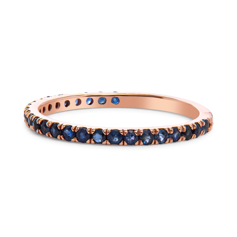 This 14 karat rose gold band features 0.55 carat total weight in round, natural blue sapphires. It can be worn alone or stacked with other bands for a one of a kind look. It currently is a size 7.75 but can be resized upon request.