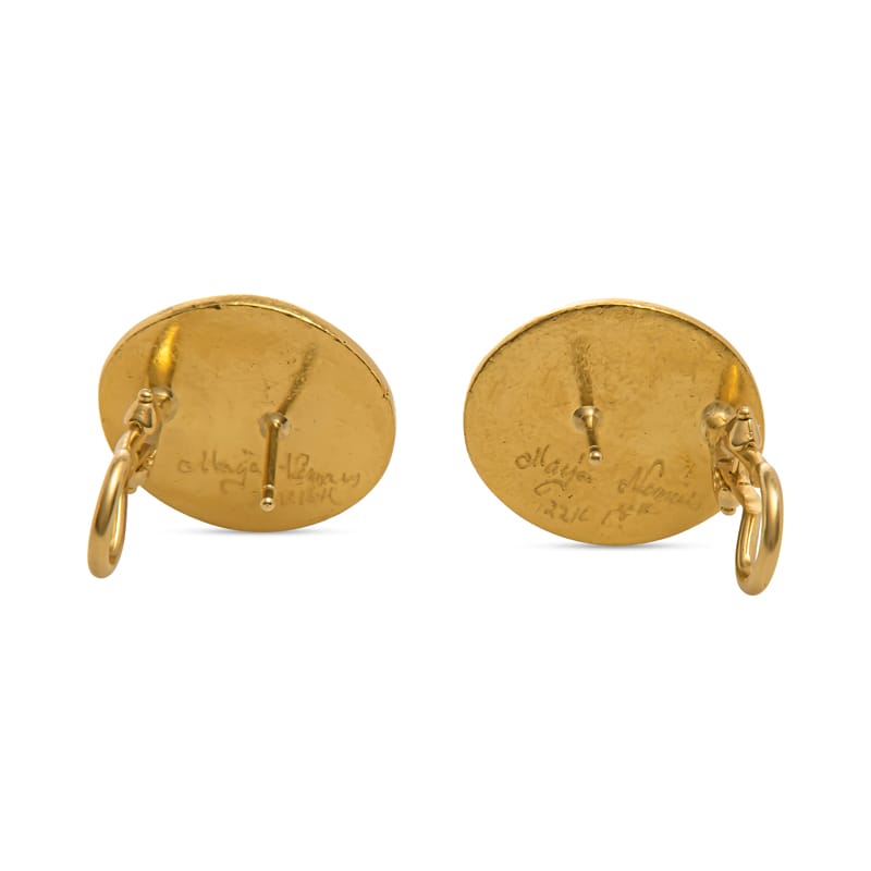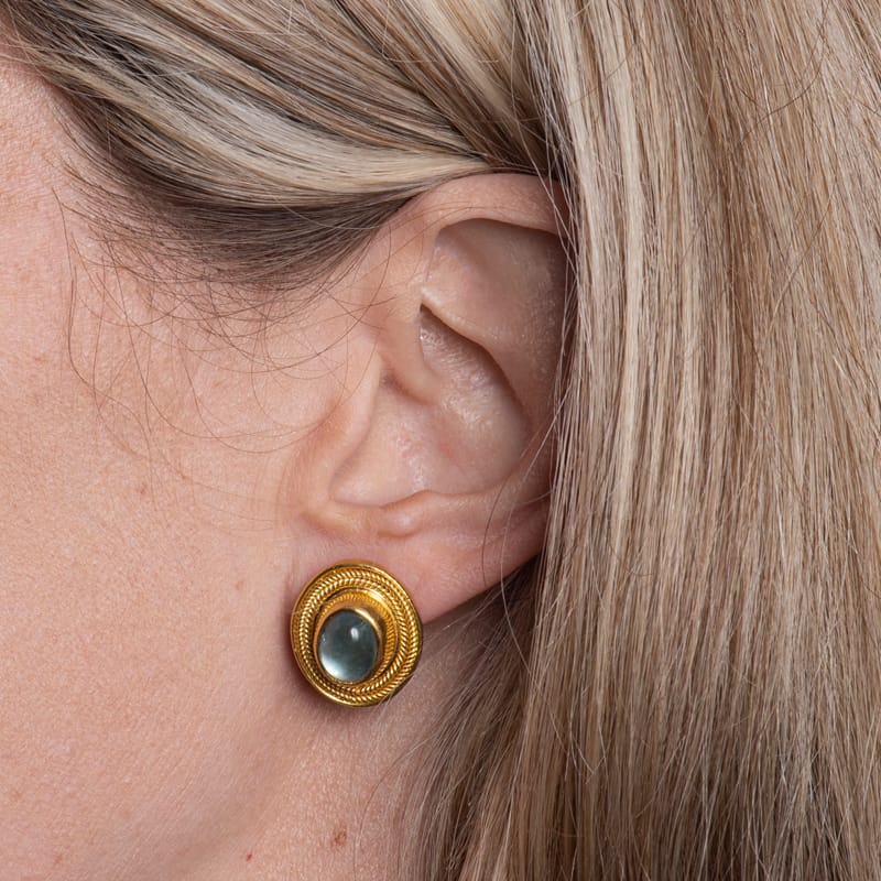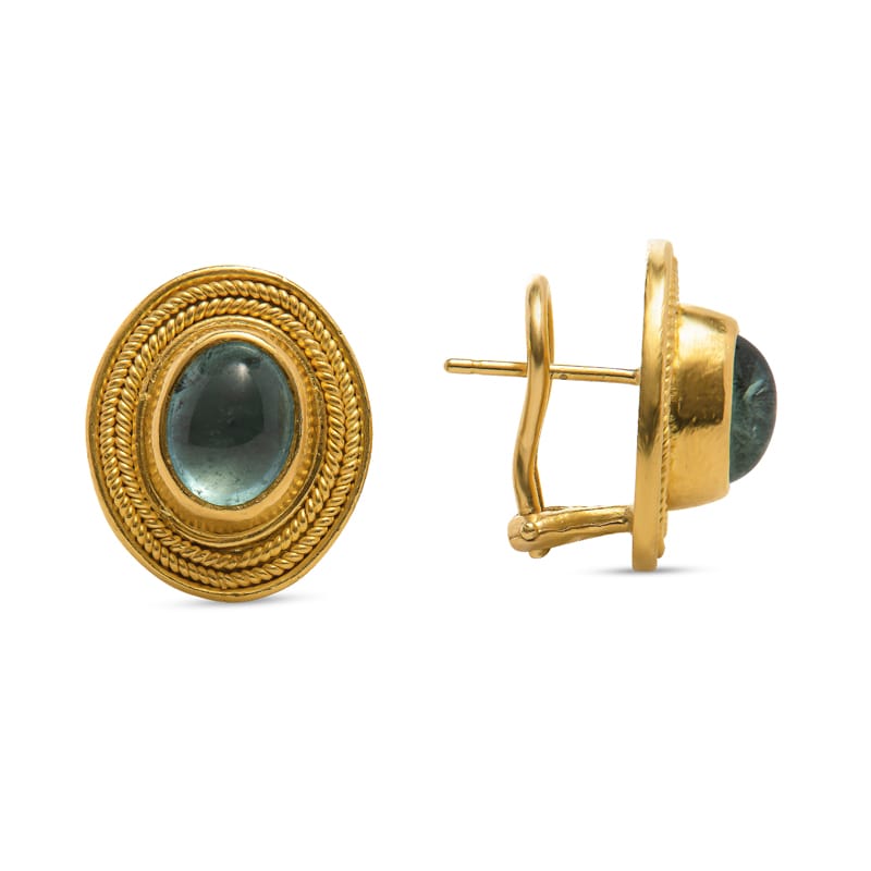 These unique and beautiful earrings featuring two oval blue bezel set tourmalines set in 22 karat yellow gold. The tourmalines are surrounded by textured detailing. Omega with post back.