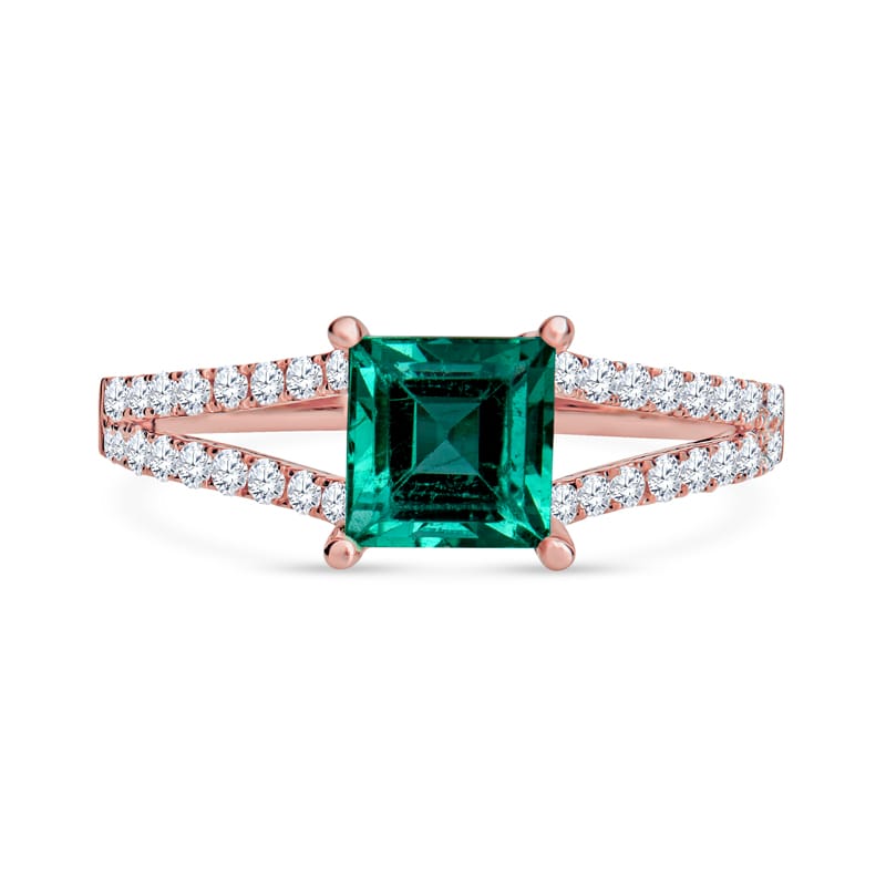 This exquisite ring features a captivating 1.24 carat Carré (Square Baguette) Colombian emerald elegantly set in a luxurious 14 karat rose gold split shank setting. It is complemented by 0.35 carat total weight in round brilliant diamonds. This ring is a size 7 but can be resized upon request.