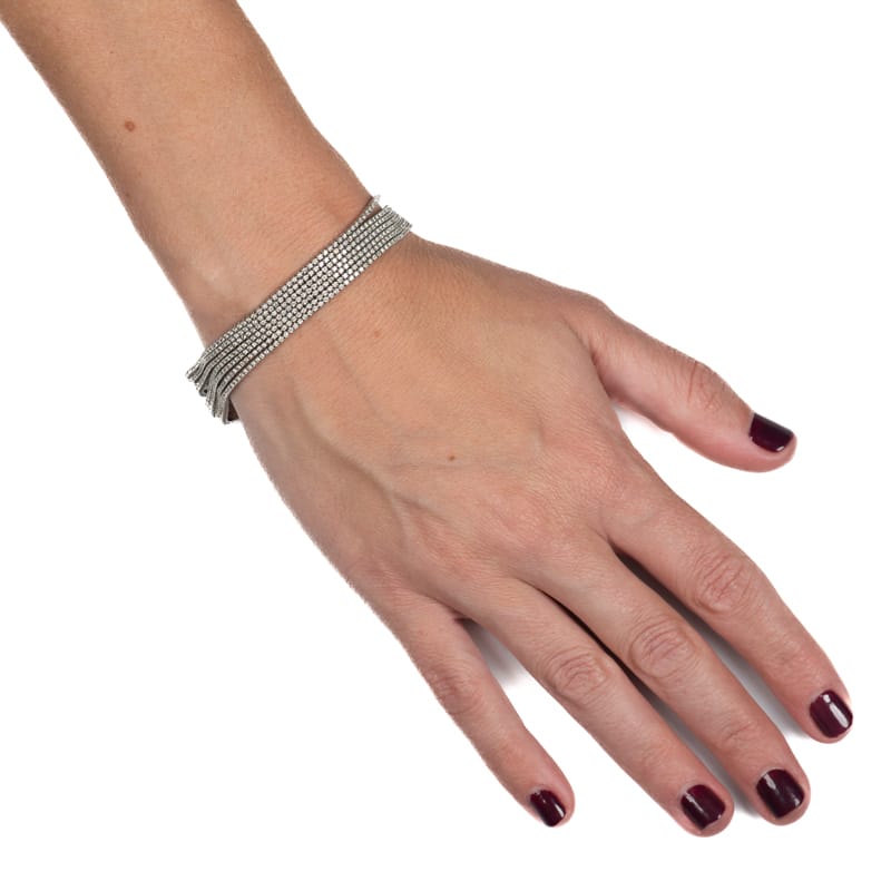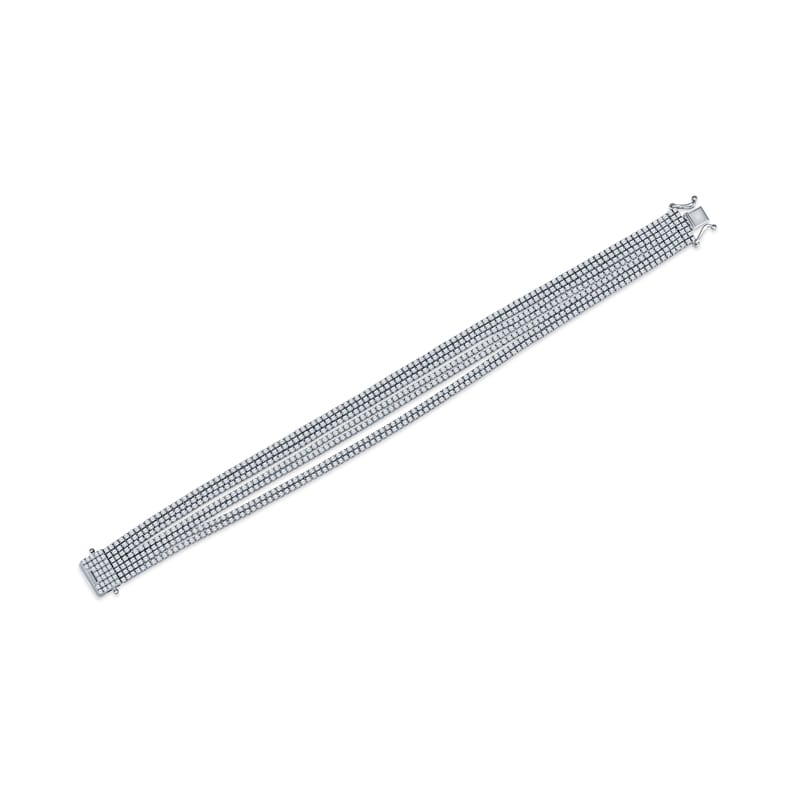 This dainty bracelets features 7 rows with 5.60 carat total weight in round diamonds set in 14 karat white gold. Box clasp with double safety closure. The length is 7″.
