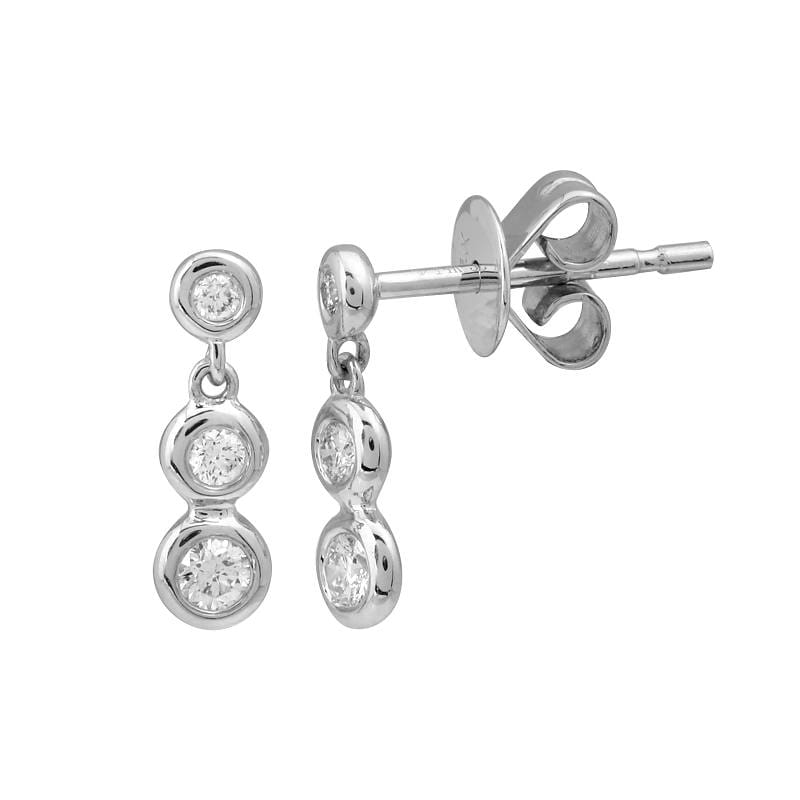 These dangle earrings feature 0.17 carat total weight in bezel-set graduated dangle earrings set in 14 karat white gold. Friction post with butterfly back.