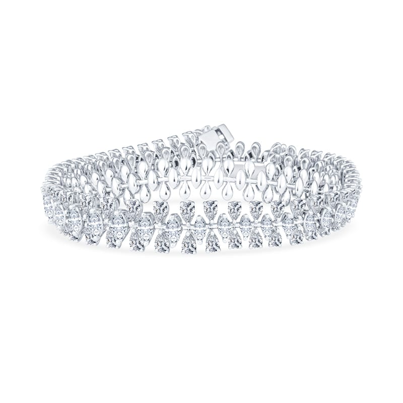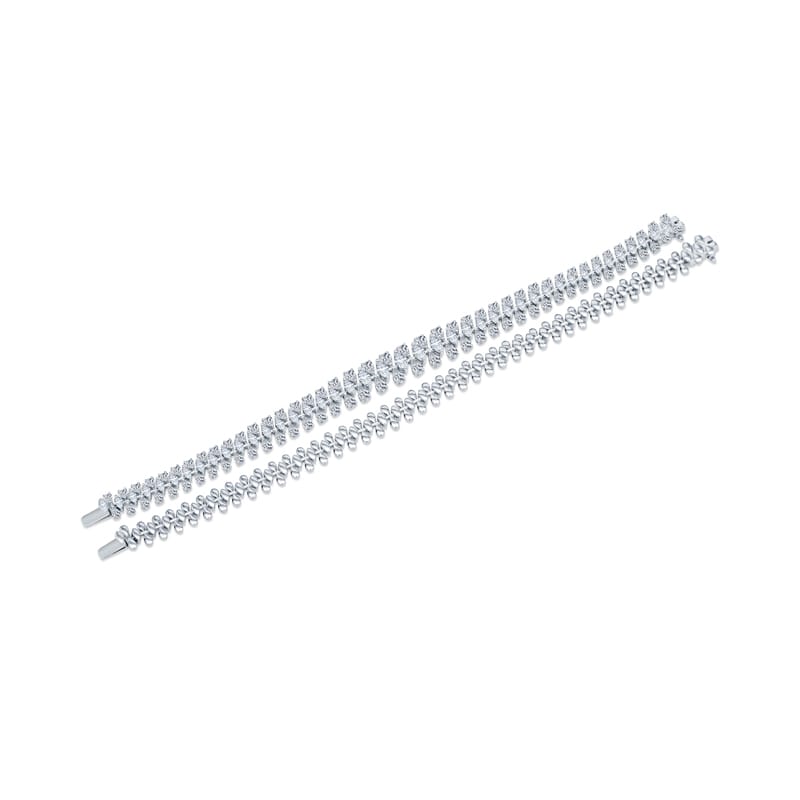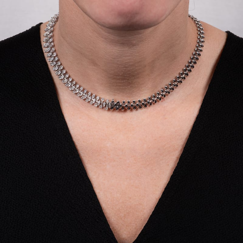 This unique and fun necklace features 11.47 carat total weight in marquise and pear shaped natural diamonds set in 18 karat white gold. It detaches into two bracelets for many other ways to wear. Wear as a necklace, wrap bracelet, two bracelets together, or separate. This will become your most worn piece! Box clasp with safety.