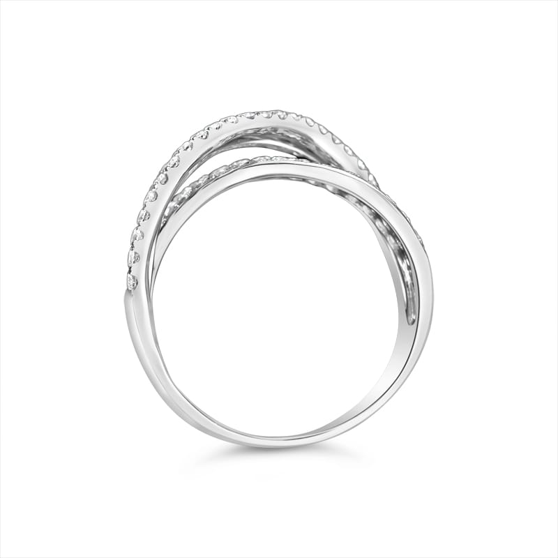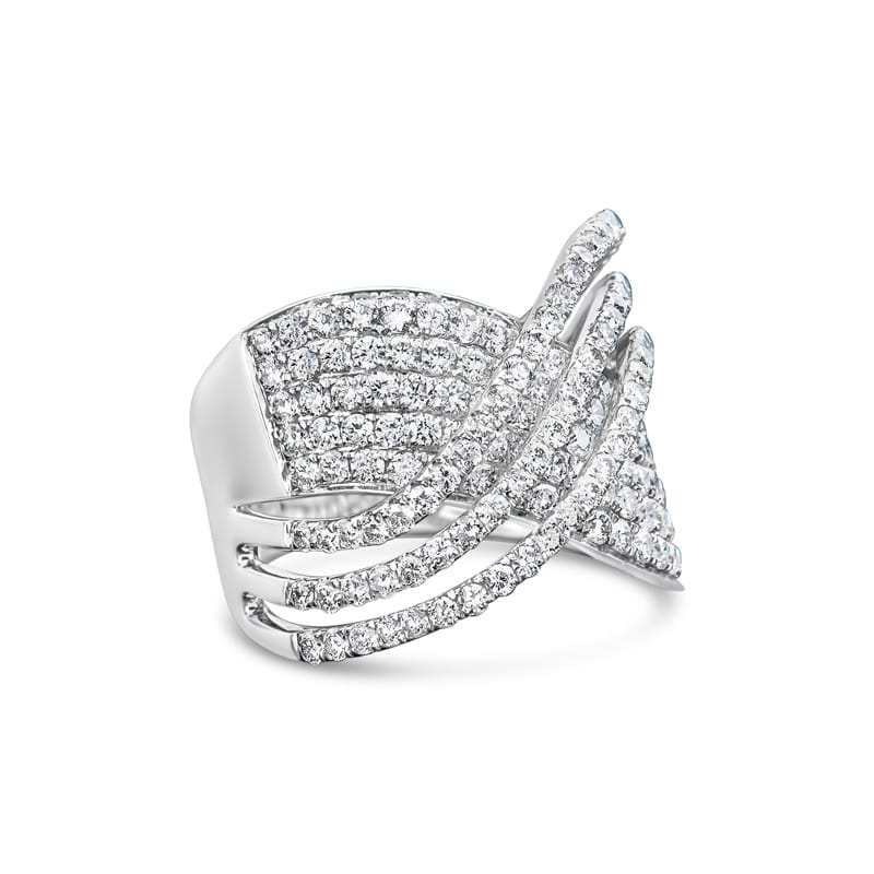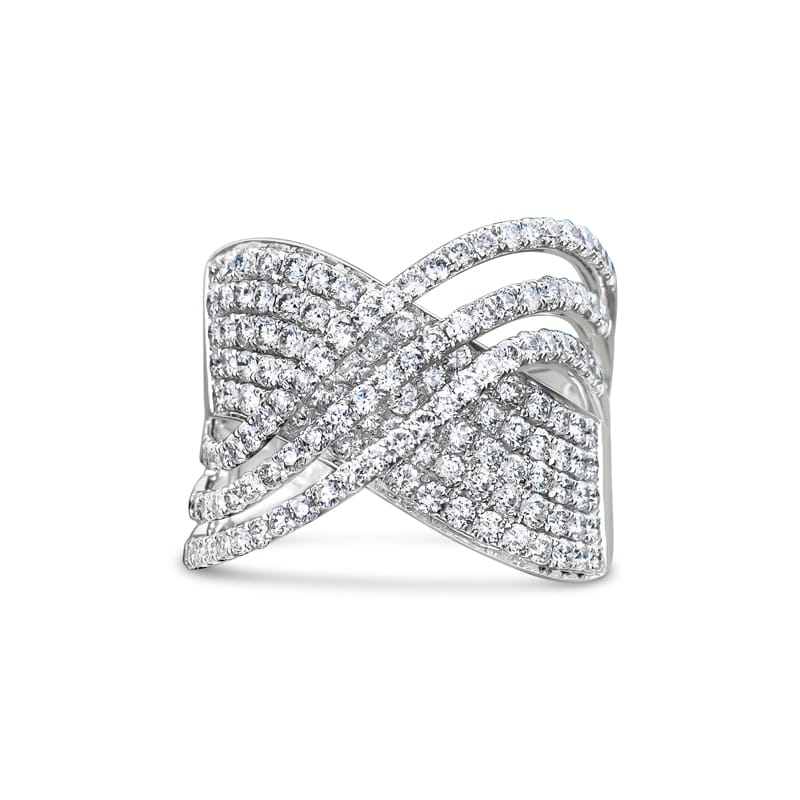 A unique ring that features 1.77 carat total weight of prong and pave set round brilliant diamonds in an overlapping criss-cross design set in 18 karat white gold. The ring is currently a size 6 but can be resized upon request.
