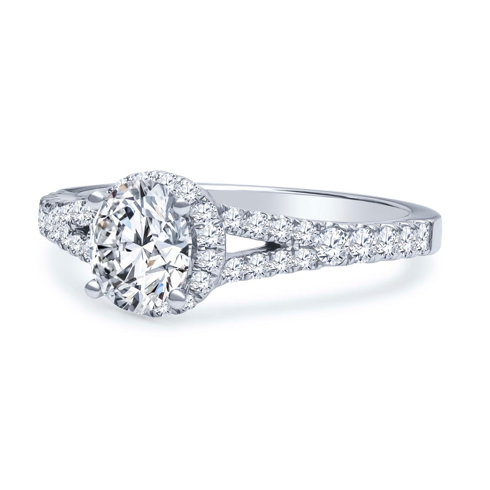 18kt white gold double round halo cathedral split-shank semi mount set with a 0.45ct total weight in round brilliant diamonds set in a split prong set.