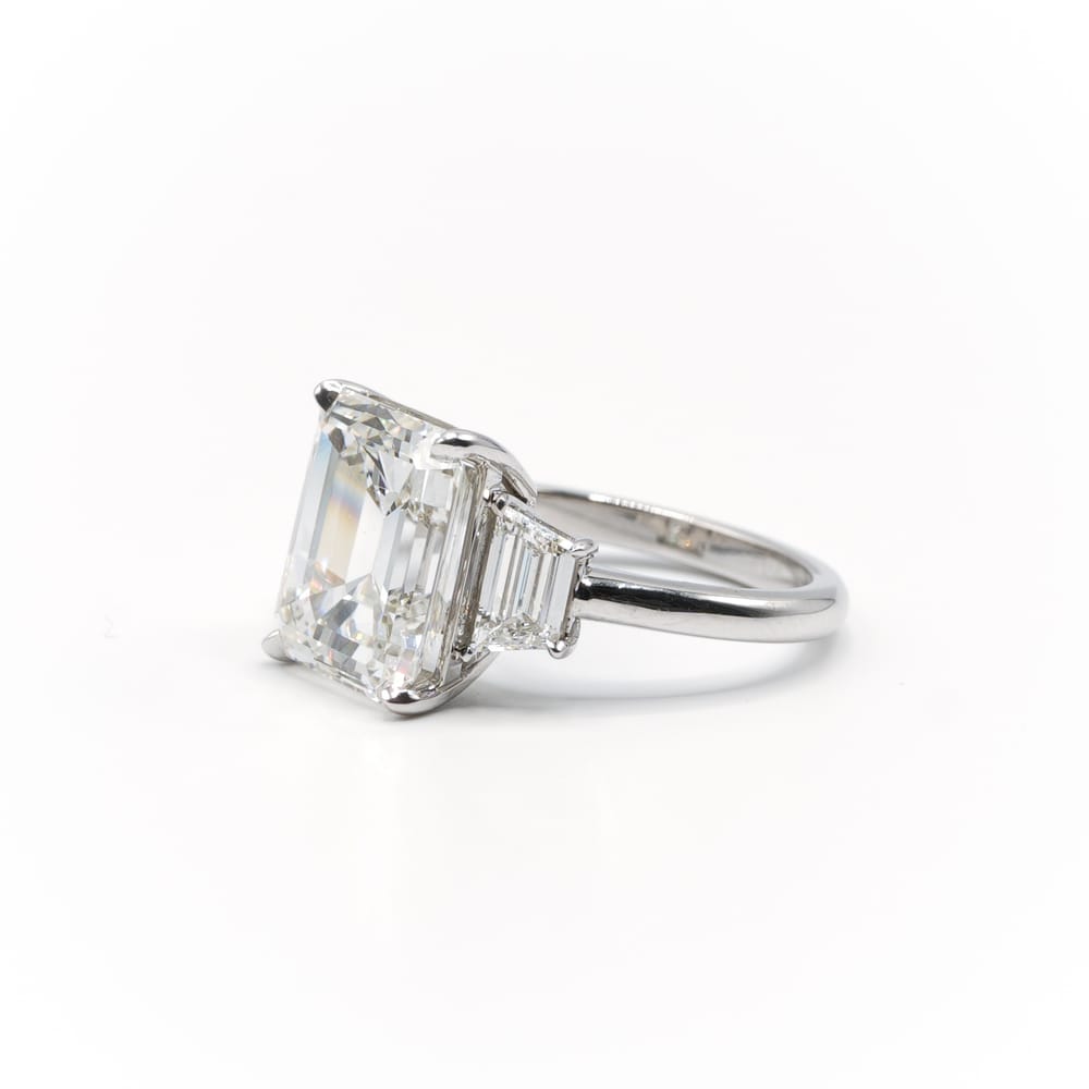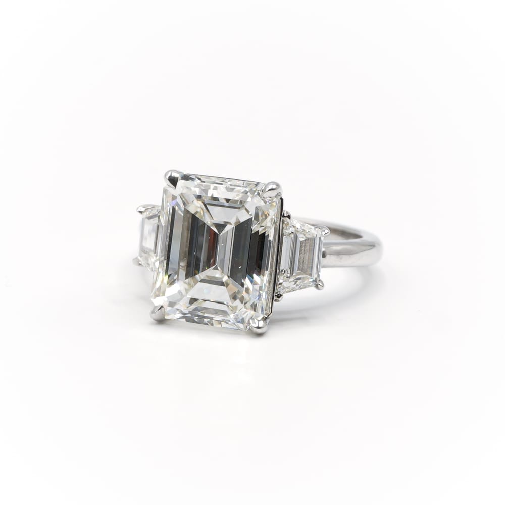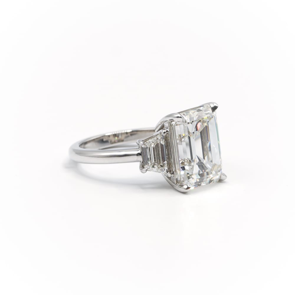 This exquisite three-stone engagement ring features a brilliant emerald cut center diamond, weighing 6.50 carats, graded J VS2 by GIA. It is accented by two trapezoid side diamonds with a total carat weight of .99 carats. Crafted in lustrous platinum, this design beautifully showcases the natural sparkle of each diamond, making it a perfect choice for the special moment. This is a classic ring that you will cherish for years to come. It is a size 6.5 but can be resized upon request.
