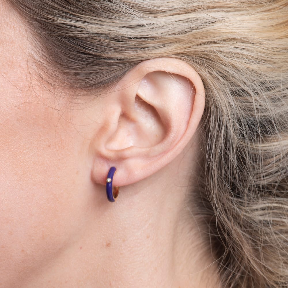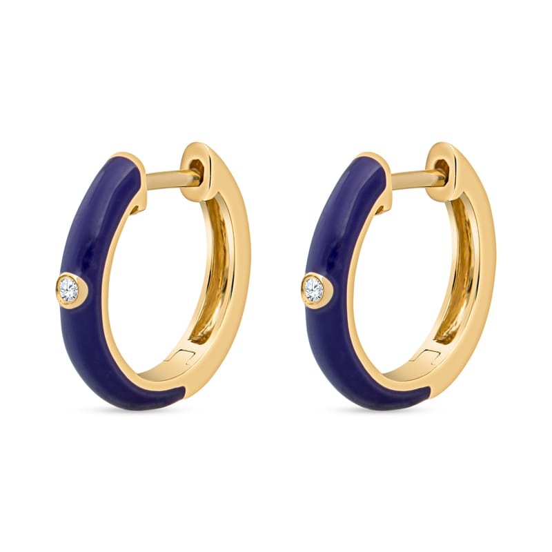 These fun 14 karat yellow gold hoop earrings feature purple enamel and a single diamond. Wear alone or layer with other earrings.