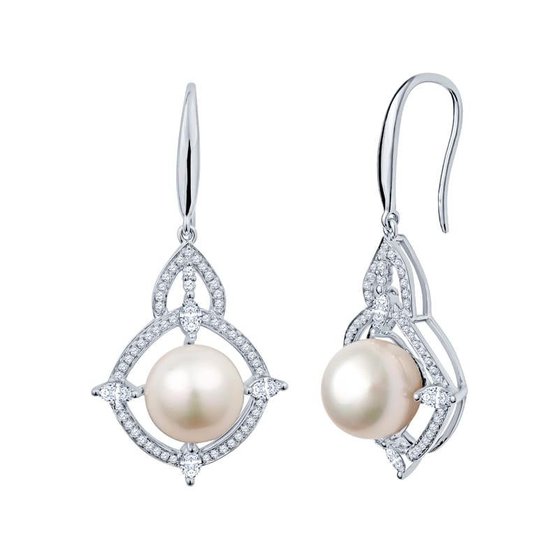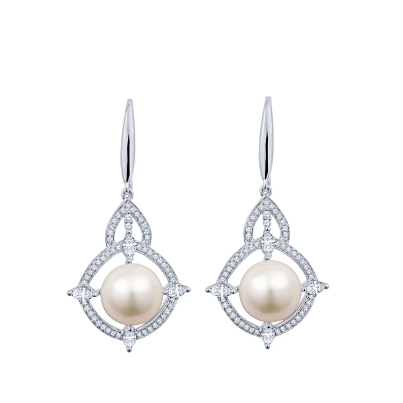 Elevate your elegance with these exquisite freshwater pearl drop earrings, crafted from luxurious 18 karat white gold. The design showcases a 9.6mm pearl, elegantly accented by dazzling marquise and round brilliant diamonds, totaling 1.15 carats.