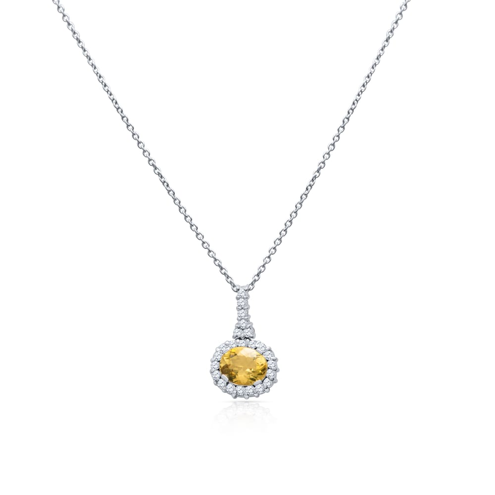 18K white gold pendant with one 2.28 carat oval golden beryl center stone that is set horizontally. The beryl is surrounded by 0.69 carats total of round brilliant cut diamonds with a color between H-I and VS2- SI1 clarity The pendant is attached to an 18K white gold cable chain with a length of 18 inches.
