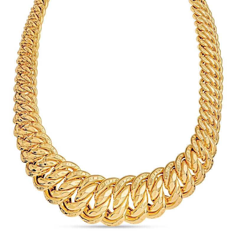 Elevate your style with this exquisite 14 karat yellow gold Italian collar necklace, meticulously crafted to add a touch of sophistication to your ensemble. At 82.70 grams and 17 inches long, this piece is perfect for women looking to enhance their jewelry collection with a timeless masterpiece. The total length is approximately 17.5″ wide and the width at the widest point is 1.25″.