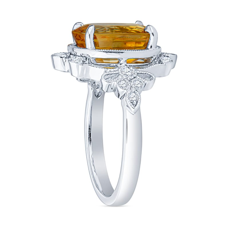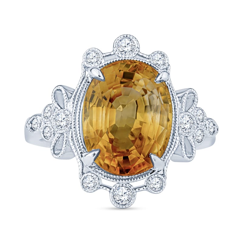 This vintage inspired ring features a 5.70 carat orange-yellow oval cut sapphire accented by 0.20 carat total weight in round diamonds with milgrain details set in 14 karat white gold. This ring is currently a size 6 but can be resized upon request.