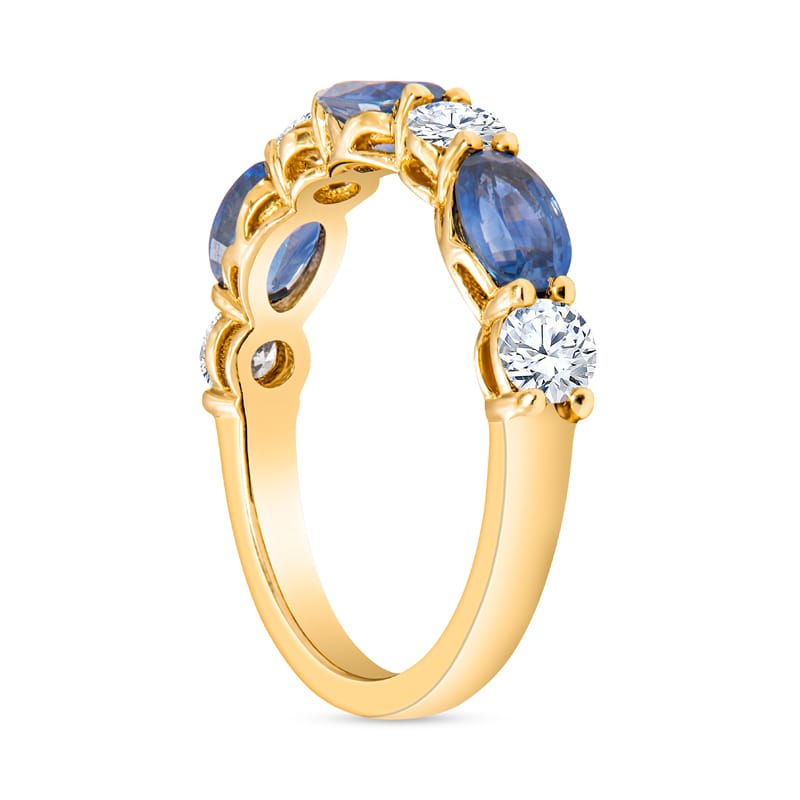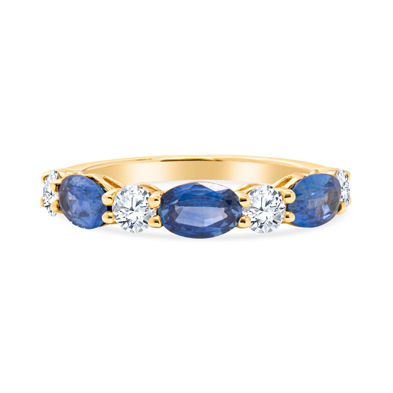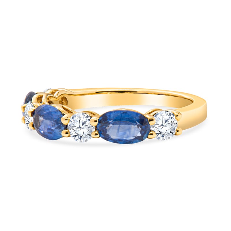 This 14 karat yellow gold band features 1.56 carat total weight in oval shaped natural blue sapphires alternating with 0.58 carat total weight in round diamonds set in 14 karat yellow gold. It is a size 6.5 but can be resized upon request.