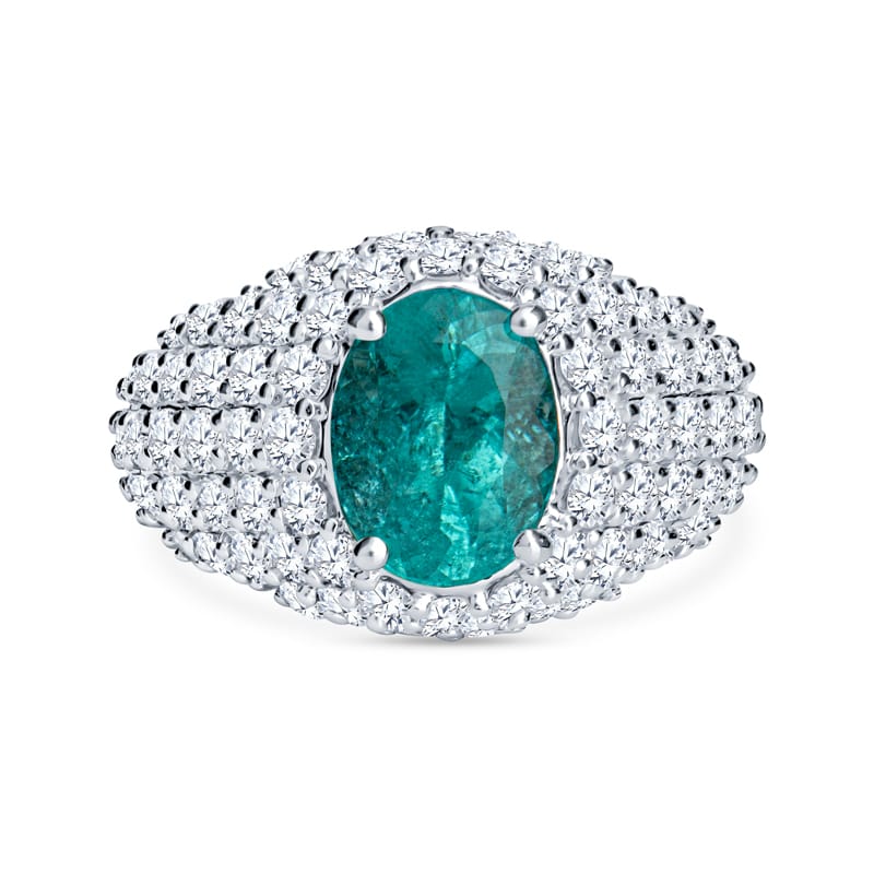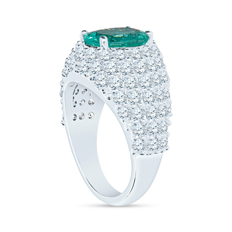 Adorn your finger with this exquisite ring featuring a 2.33ct oval cut green-blue Brazilian Paraiba tourmaline, GIA certified, complemented by 2.50 carats of round brilliant cut natural diamonds. Crafted in luxurious 18 karat white gold, this piece combines elegance and sparkle for the perfect statement accessory. This ring is a size 6.25 but can be resized upon request.
