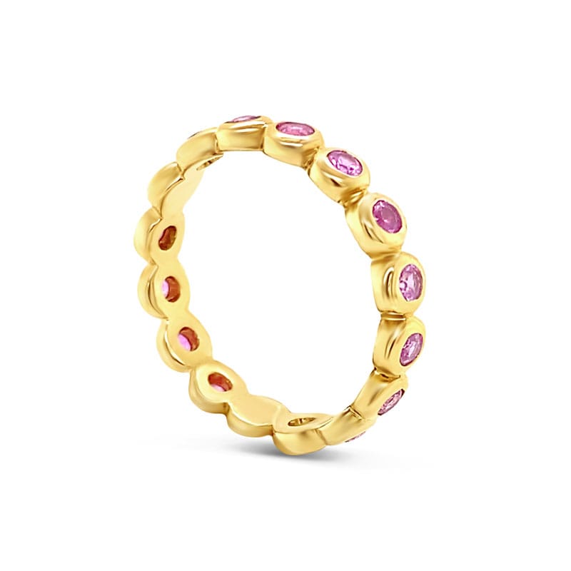 This versatile and beautiful eternity band features 0.83 carat total weight in round pink sapphires that are bezel set in 14 karat yellow gold. This ring is a size 7.