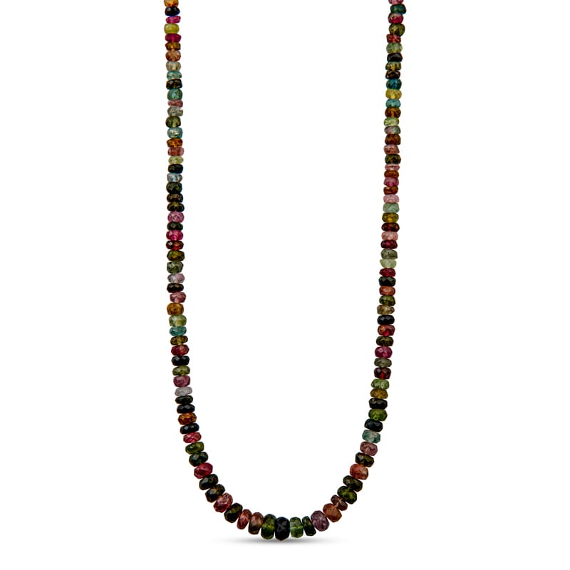 This necklace features rainbow tourmaline beads with a sterling silver chain. It is perfect for layering or adding your favorite charms. The length is adjustable from 16-18″.