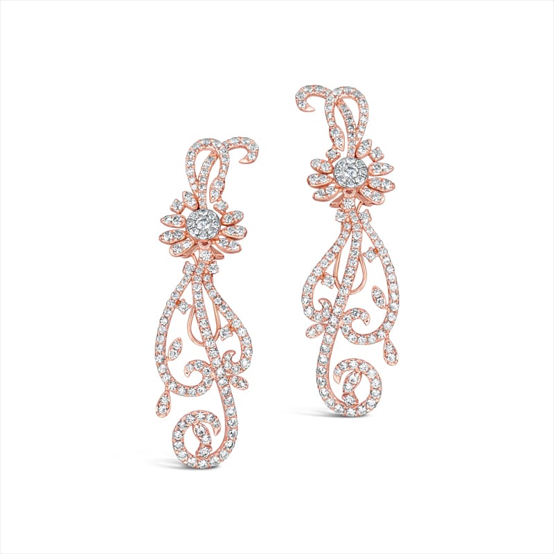 These swirled earrings are crafted in 18 karat rose gold and feature 4.70 carat total weight in micro prong-set round brilliant diamonds. You will definitely make a statement when wearing these. French wire back.
