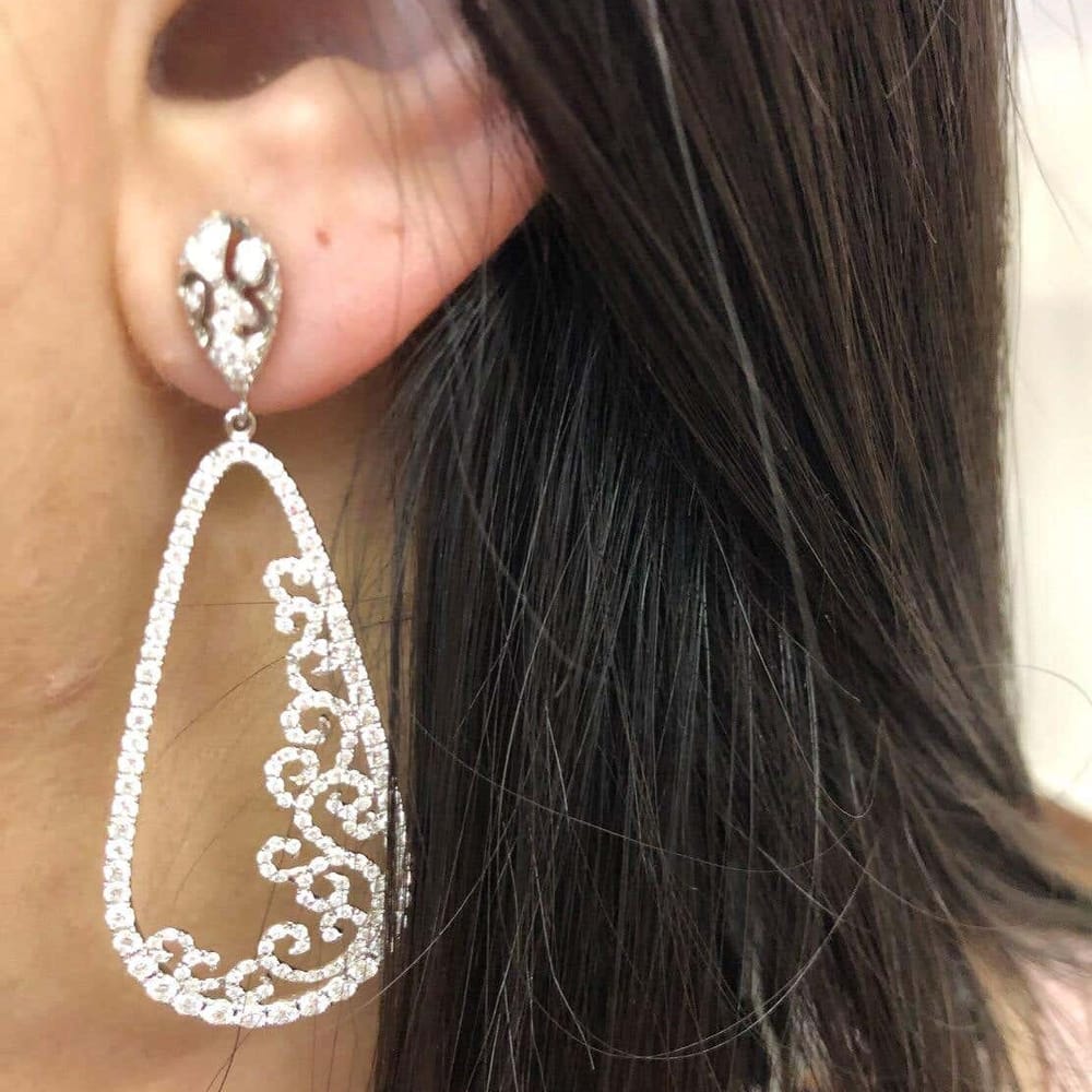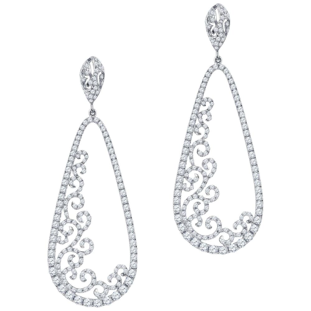 These elegant drop earrings feature a captivating design with 3.88 carat total weight of round brilliant diamonds expertly set in luxurious 18 karat white gold. Crafted for women who appreciate timeless sophistication, these earrings are sure to enhance any outfit with their radiant sparkle.