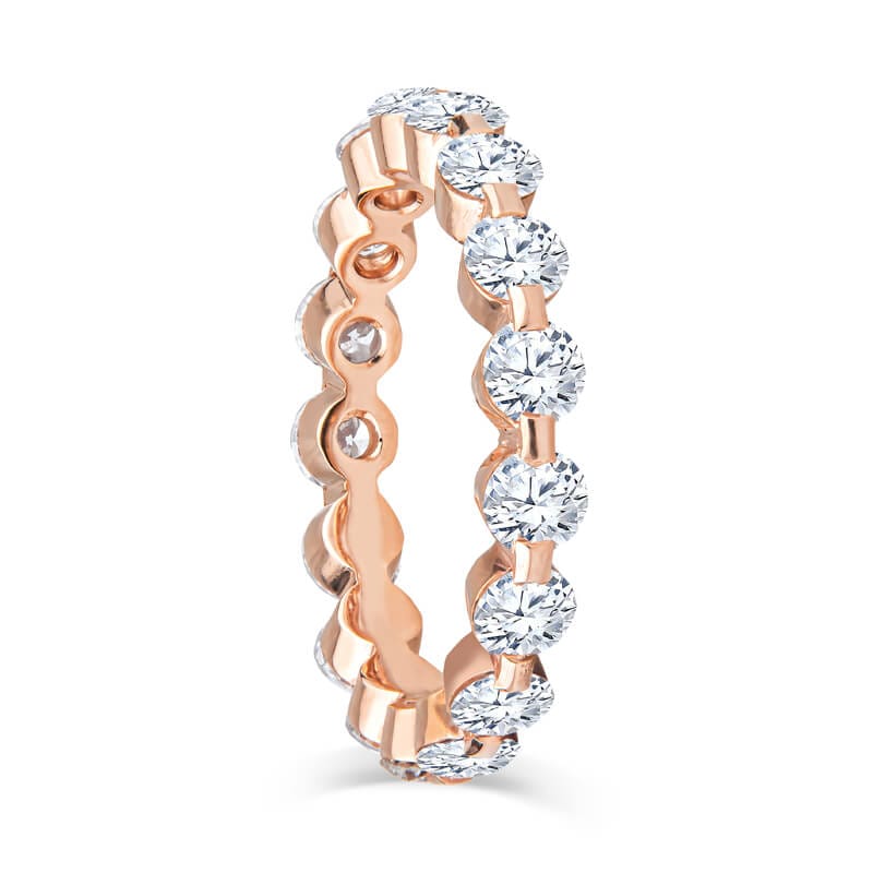 This gorgeous eternity band features 2.75ct total weight in round diamonds, set in a beautifully crafted 18kt rose gold shared prong band. The ring is a size 7 currently; contact us for sizing options. The diamonds are of VS1 clarity, E-F color; absolutely stunning, and further complemented by the rosy hue of the metal.