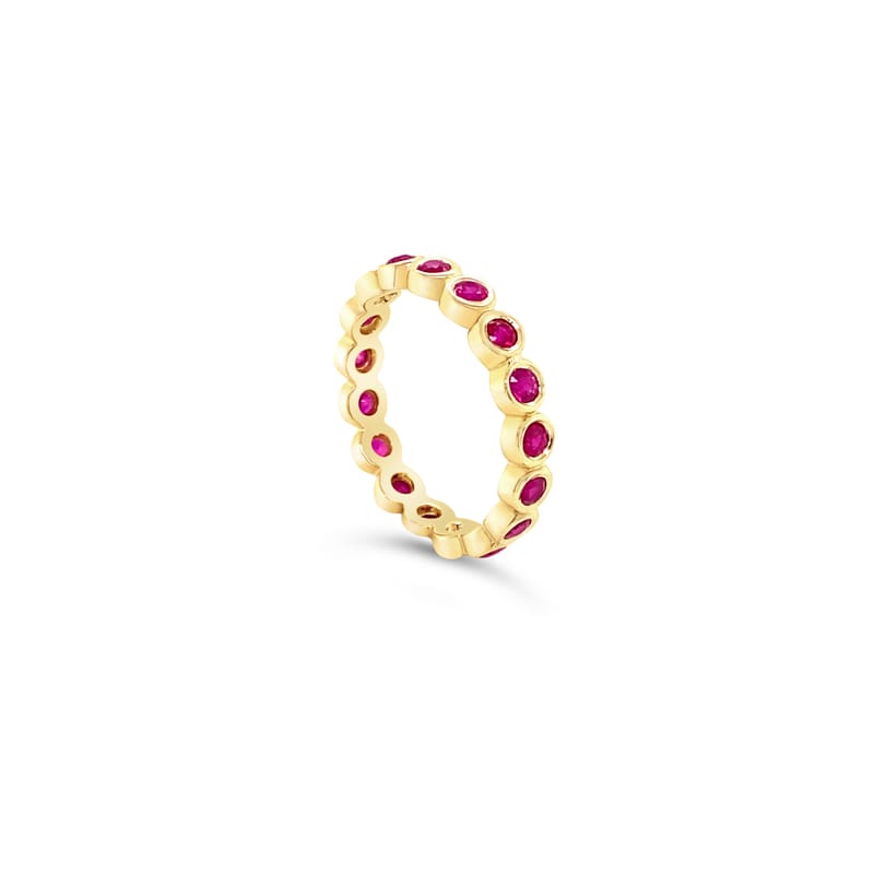 This beautiful eternity band features 1.10 carat total weight in round rubies bezel set in 14 karat yellow gold. It can be worn alone or stacked with your other favorite rings! This ring is a 6.75 and can be resized upon request.