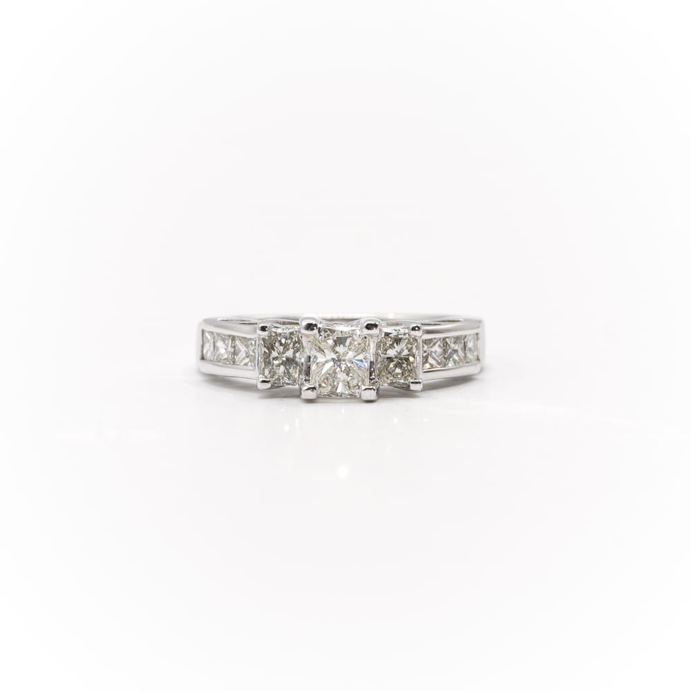 This exquisite engagement ring features three brilliant radiant cut diamonds totaling 1.90 carats, beautifully complemented by six channel set princess cut diamonds. Crafted in luxurious 14 karat white gold, it’s a perfect symbol of everlasting love for that special woman. This ring is a 6.75 but can be resized upon request.