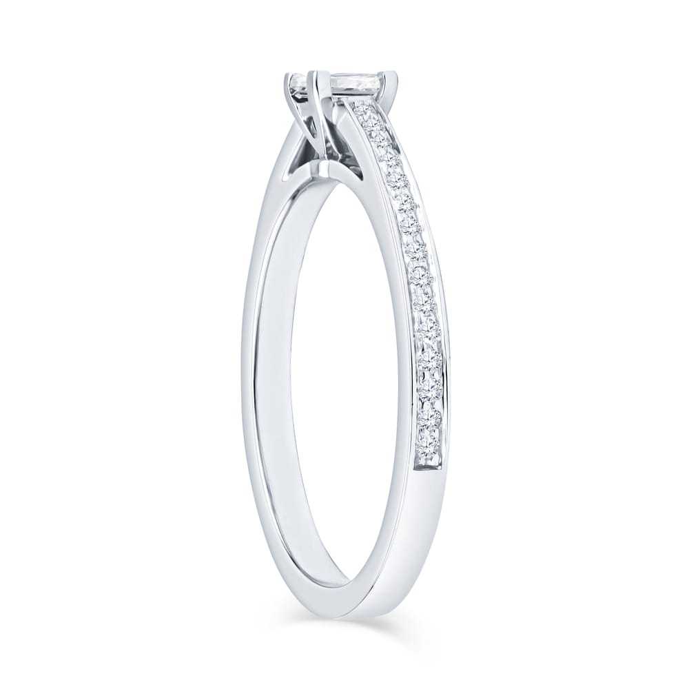 This dainty Tiffany & Co. design is the Grace Diamond Ring, featuring an approximately 0.17ct princess cut diamond center, with about 0.19ctw in round accent diamonds, set in a platinum ring. The diamonds are of D-F color, VS1-VVS1 clarity. This ring is BRAND NEW, in a size 8.5 (can be resized), and comes with the original box. The MSRP for this ring is $3000. Hallmark states Tiffany & Co. PT950.
