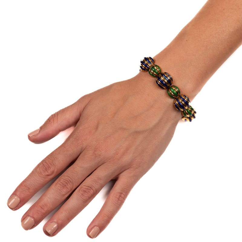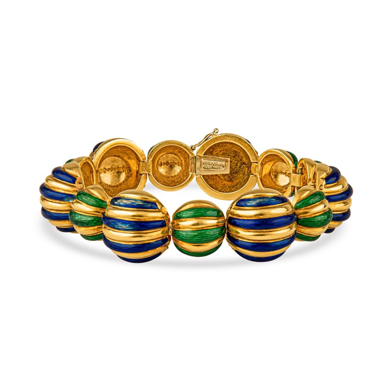 This vintage bracelet from Tiffany & Co. features vibrant green and purple enamel on carved 18 karat yellow gold links. Box with safety clasp. This bracelet can be worn everyday or saved for special occasions. Made in Italy. Bracelet circa 1940-1950.