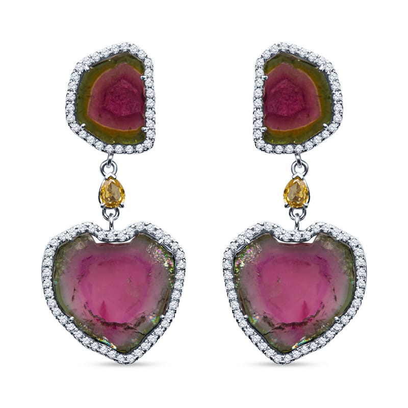 This stunning pair of Watermelon Tourmaline Earrings are a perfect pairing for a day to night look. These custom made heart shaped earrings are crafted from free form natural watermelon tourmaline slices set in 18kt white gold. They are accented by 1.33ct total weight in round natural diamond halos and 0.40ct total weight in two pear shape natural yellow diamonds