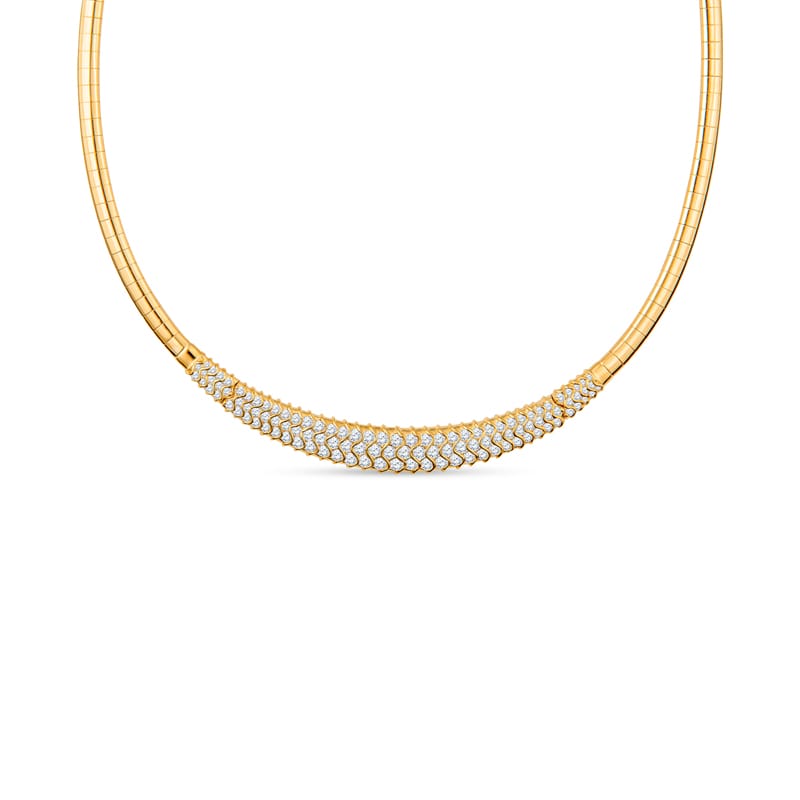This exquisite omega necklace is crafted from 18 karat yellow gold and features 5 carats of natural round diamonds. With a polished finish and a luxurious design, it is the perfect accessory for any elegant occasion.