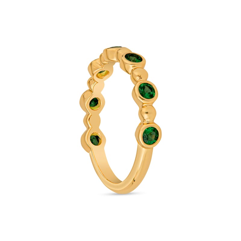 This elegant 18 karat yellow gold ring features a delightful arrangement of natural tsavorite gemstones in a vibrant green color alternating with a gold bead. Perfect for stacking or worn alone, it adds a touch of sophistication to any outfit. This ring is a size 6.75 but can be resized upon request.